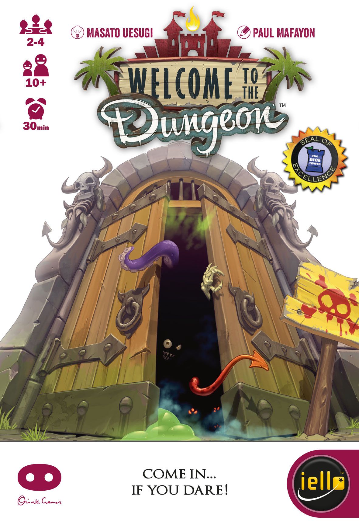 Welcome to the Dungeon — first released as Dungeon of Mandom — is a push-your-luck dungeon delve in which 2-4 players take turns essentially daring each other to go into a dungeon with less equipment than they start off with while filling the dungeon with monsters. Players can win the game by winning 2 rounds or get eliminated from the game by losing 2 rounds. Each player has a 2-sided players card that has a white side and a red side. The first win taps the player card and the 1st loss flips the card over to the red side. A 2nd loss will have the player turn the card back into the box.<br/><br/>The game is played in rounds. The player sets up the base character and all the equipment equipped. This represents every player as a fully equipped dungeon delver.<br/><br/>Each round, the start player (the person who challenged the dungeon last or the last player to be in a dungeon) can choose to draw a card from the monster deck or pass their turn.<br/><br/>If they choose to draw, they can do one of two things: (1) keep it and de-equip an equipment or (2) place it face down in the dungeon. Placing it face down in the dungeon creates the dungeon deck and fills the dungeon with monsters that the challenger will have to face later. If they choose to pass their turn, they cannot participate in the rest of the round. Once only one person is left after all the other players have passed their turn, that player then becomes the challenger and must go into the dungeon with only the equipment he has equipped.<br/><br/>The player then flips cards off the dungeon deck and fights the monsters within. Some equipment allow you to null the enemy damage or be able to withstand it by increasing your HP. If the player survives the dungeon with at least 1 HP, they win that round. If not, they lose. The players then reshuffles all the cards to make a new monster deck and re-equips all the equipment to start a new round.<br/><br/>The game ends when someone has won twice or one player is the last man standing.<br/><br/>Welcome to the Dungeon includes four different sets of character cards whereas Dungeon of Mandom has only a single character.<br/><br/>
